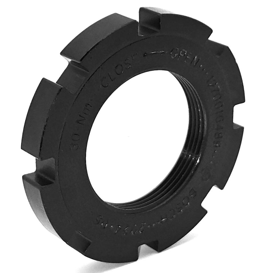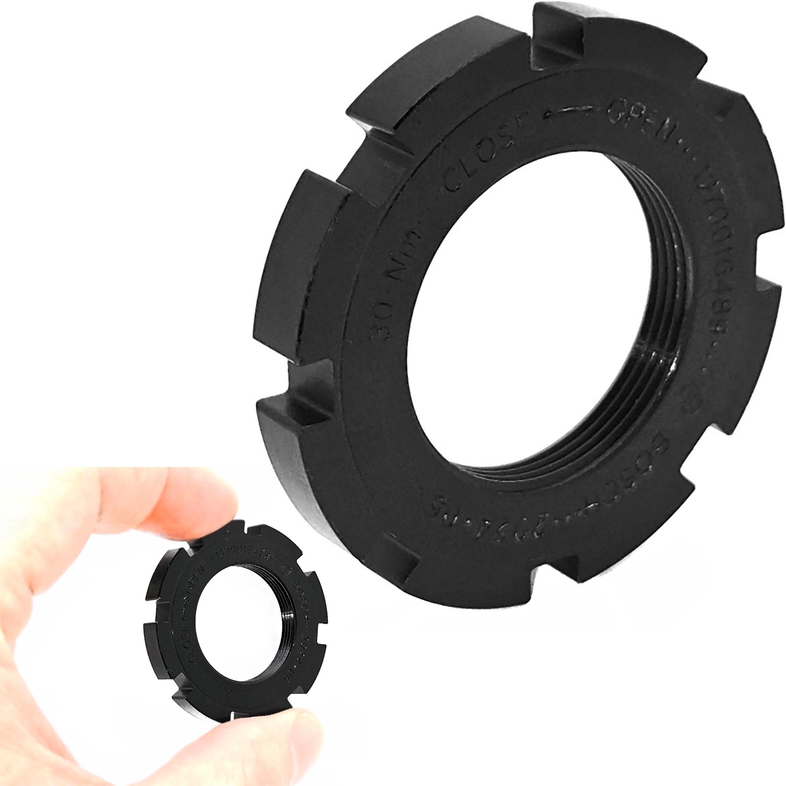Pierścień do trzymania zębatki w silniku Bosch e-bike, znany również jako nakrętka blokująca, jest niezbędny do montażu i demontażu tarczy napędowej w rowerach elektrycznych z silnikami Bosch. Jest to oryginalna aluminiowa nakrętka.